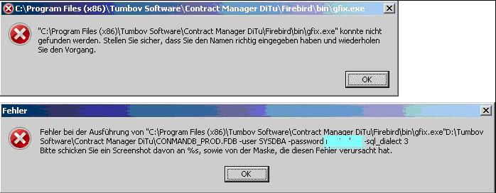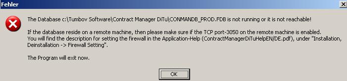 QWhy does this error message appear at the attempt to start the program: "The Database ...is not running or it is not reachable! If the database resides on a remote machine, then please make sure if the TCP port-3050 on the remote machine is enabled. You will find the description for setting the firewall in the Application-Help (ContractManagerDiTuHelpEN/DE.pdf), under "Installation, Deinstallation -> Firewall Setting". The Program will exit now."