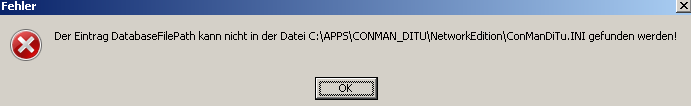 QWhy do I get the error message at program-start: "The entry DatabaseFilePath could not be found in the file ConManDiTu.INI!"