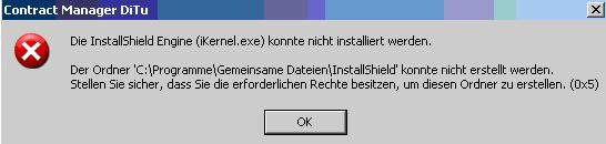 QWhy do I get the error message "The Installshield Engine (iKernel.exe) could not be installed. The folder C:\Program Files\Shared Files\InstallShield could not be created. Please make sure you possess the necessary authorization for this folder (0x5).
